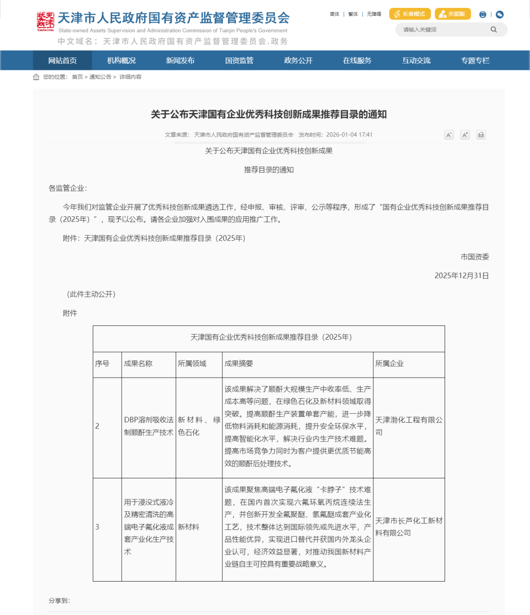 1月4日,天津市国资委发布《关于公布天津国有企业优秀科技创新成果推荐目录的通知》,经申报、审核、评审、公示等程序,遴选出10项成果形成“天津国有企业优秀科技创新成果推荐目录(2025年)”,渤化集团“DBP溶剂吸收法制顺酐生产技术”“用于浸没式液冷及精密清洗的高端电子氟化液成套产业化生产技术”两项技术成果成功入选。