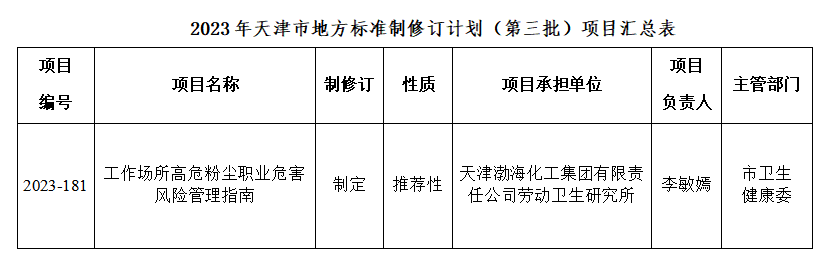 近日,2023年天津市地方标准制修订计划(第三批)发布,天津渤海化工集团有限责任公司劳动卫生研究所承担的《工作场所高危粉尘职业危害风险管理指南》获批天津市立项。